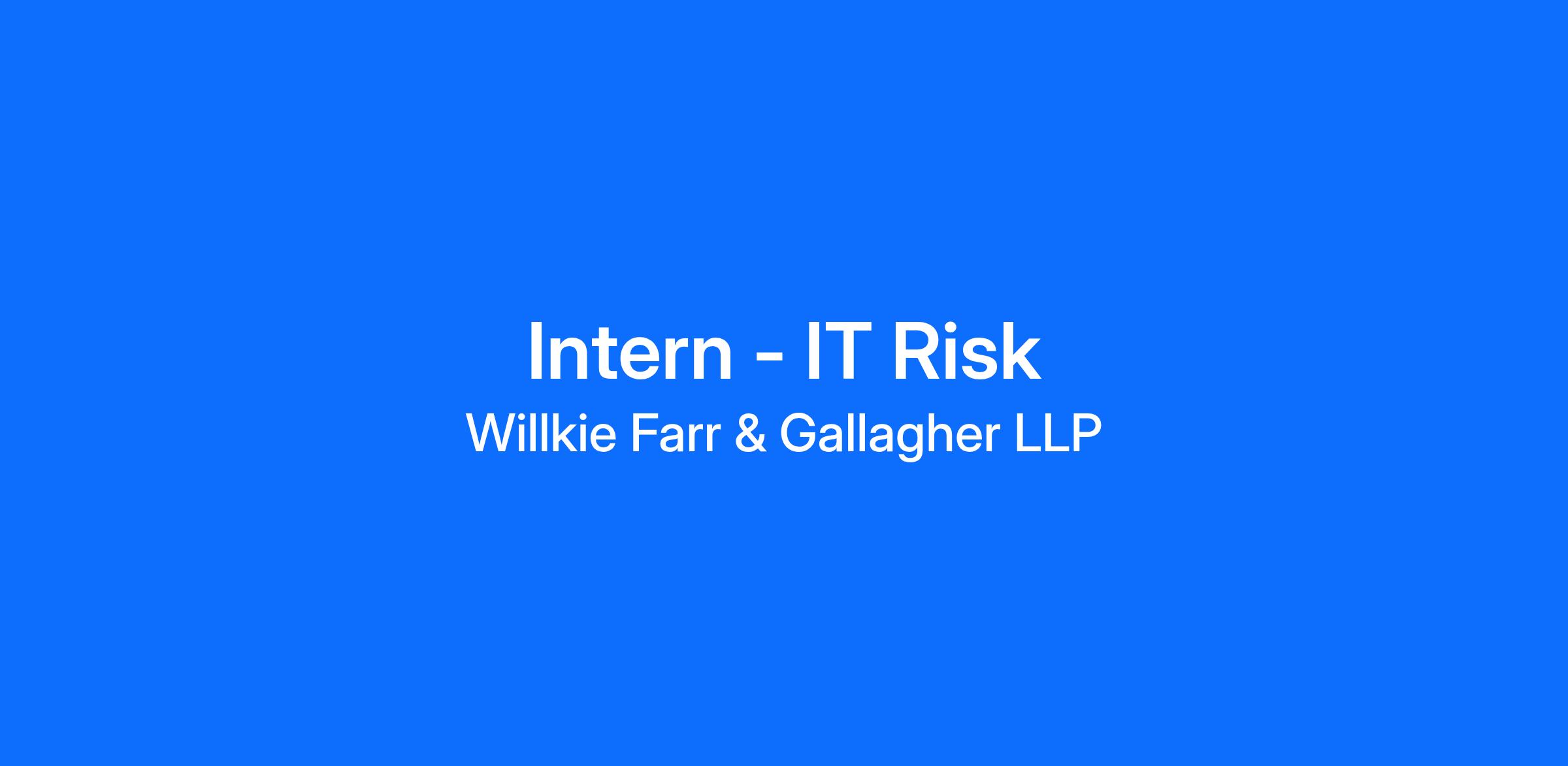 The New York office of Willkie Farr & Gallagher LLP is looking for an IT Risk Intern to support the Information Technology Team. Willkie is an elite international law firm of approximately 1,300 lawyers located in 16 offices in six countries.