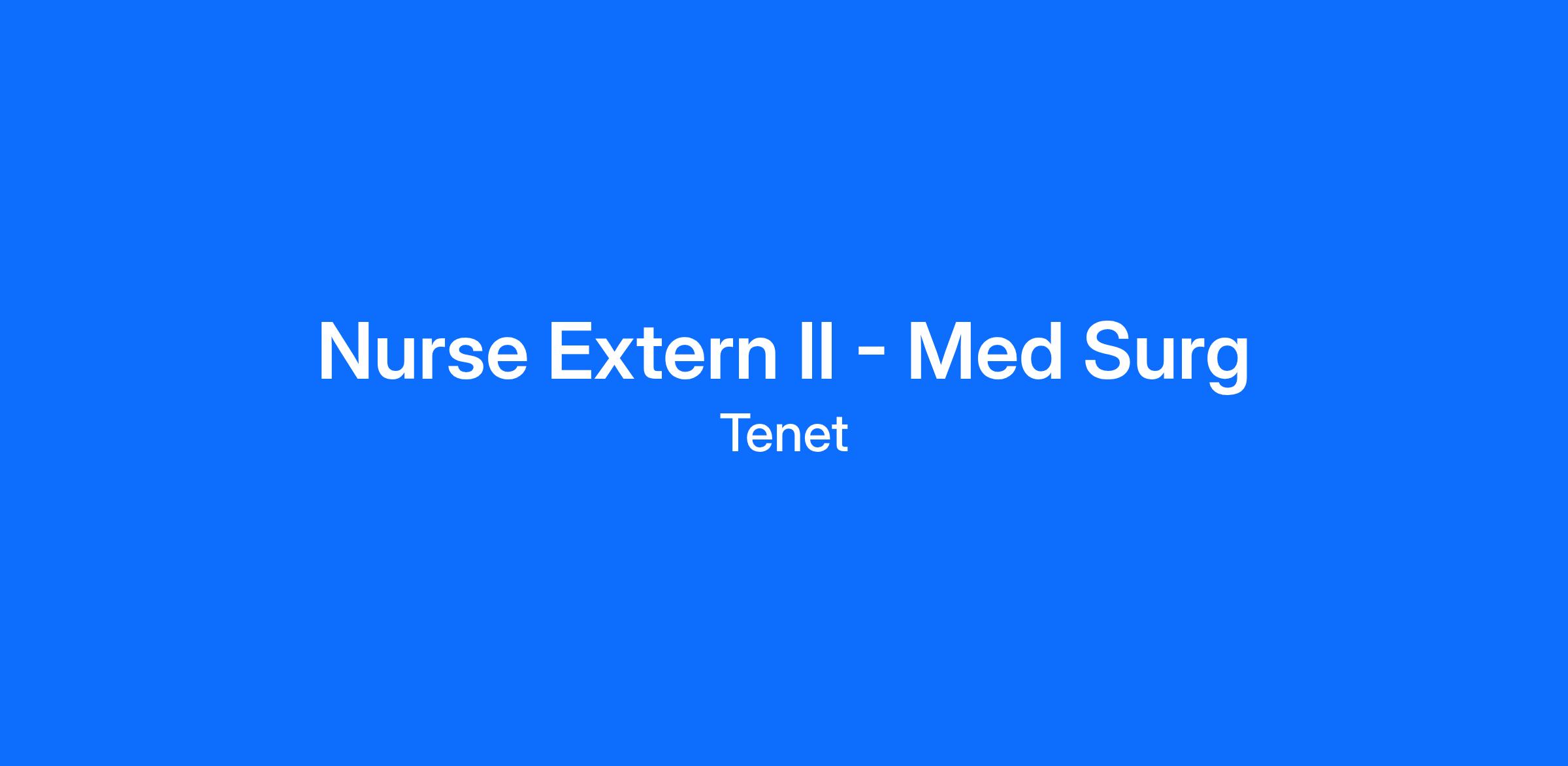 The Nurse Extern II will be assigned to an experienced RN each shift and will assist with providing patient care such as ADLS, vitals, ambulation and other duties within the scope of patient care tech or equivalent.